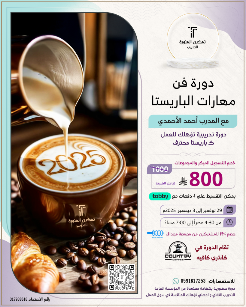 29 نوفمبر إلى 3 ديسمبر 2025ممدة الدورة: 5 أيامسعر الدورة بعد الخصم: 800 ريال رابط التسجيل في الدورة لكل من يهوى صناعة القهوة ويرغب الاحتراف في تحضيرها لرواد الأعمال وأصحاب المشاريع للباحثين عن وظيفة الباريستا تدريب يؤهلك لسوق العمل في المقاهي أو لعمل مشروعك الخاص. 📃شهادة مهنية معتمدة من المؤسسة العامة للتدريب التقني والمهني. [...]
