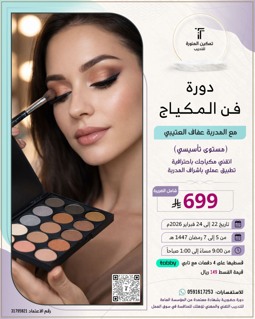 🧏🏻♀️شاركي في دورة (فن المكياج للمستوى التأسيسي) مع الميكب أرتست (عفاف العتيبي) 💄